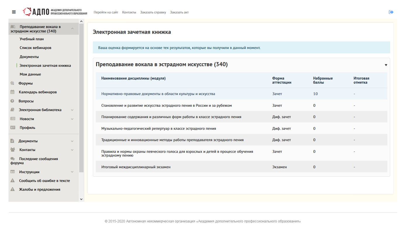 В разделе отражены результаты промежуточных и итоговых аттестаций, зафиксированы набранные баллы и итоговые отметки.