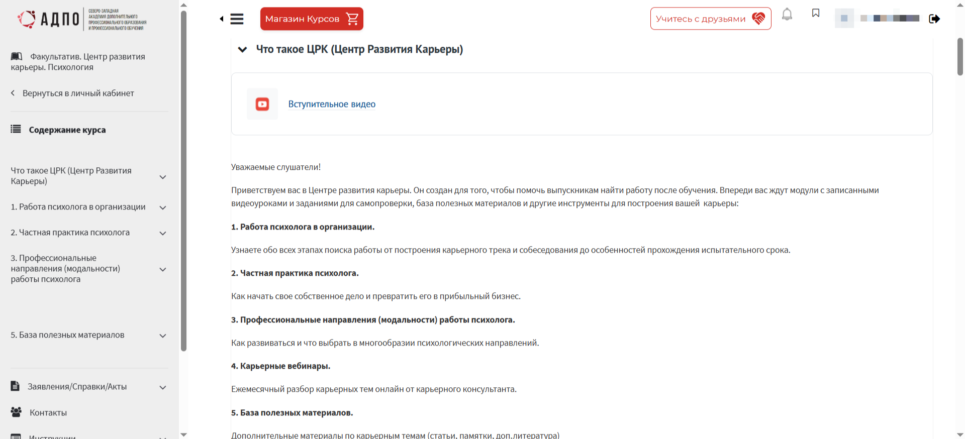 После зачисления на программу на электронную почту вы получаете письмо со ссылкой для входа в СДО, а также индивидуальные логин и пароль. В личном кабинете вам доступны основные разделы.