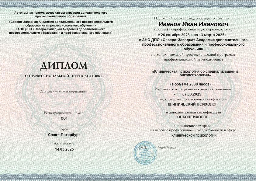 Каждый документ (диплом/удостоверение/свидетельство) соответствует п.2 ст.60 N-273 ФЗ, оформляется на русском языке, печатается на типографском бланке, защищённом от подделок. Ставится официальная печать образовательной организации. С образцами документов можно ознакомиться на сайте в разделе «Лицензия и документы».